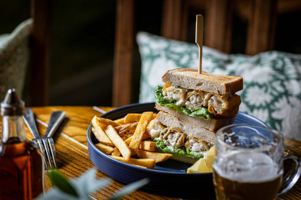 Beer-battered fish fingers, tartare sauce, toasted farmhouse bloomer (†) | 10.50 1087 kcals